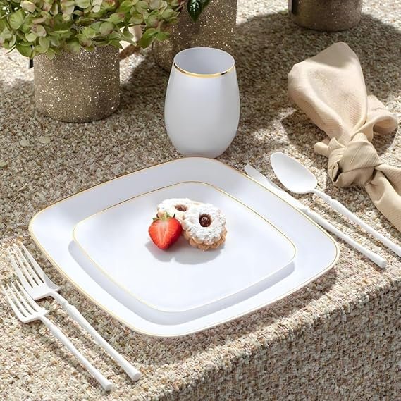 ALL OCCASION: Our fancy plastic dinnerware sets are suitable for weddings, receptions, anniversaries, birthday parties, picnics, bridal showers, holidays, family gatherings, and all other fancy dinner, our fancy disposable dinnerware will upgrade your table!