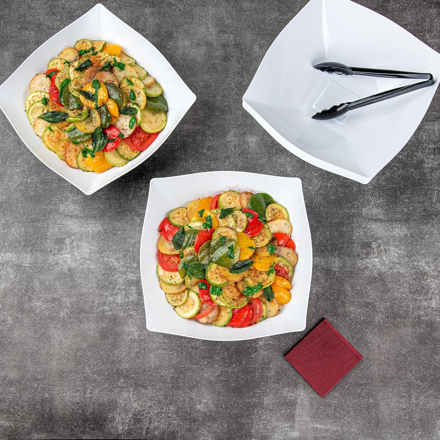10 PLASTIC CONTAINERS: Containing up to 128 ounces, each plastic bowl measures 12 inches in length by 12 inches in width by 3.9 inches in height. You will receive 10 plastic bowls.